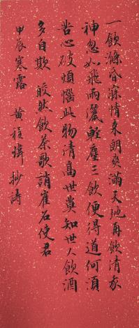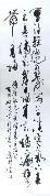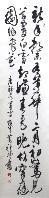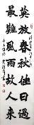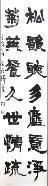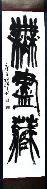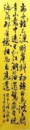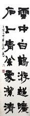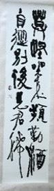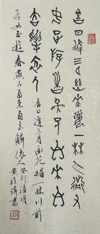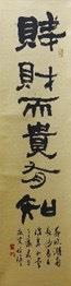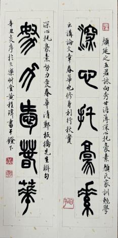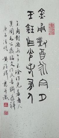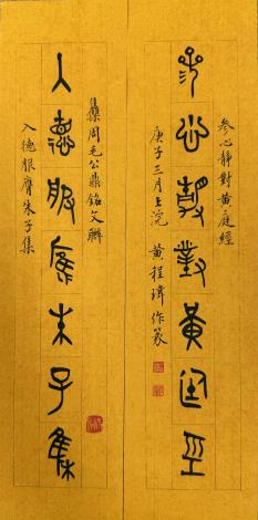 黃程瑋老師表示,書法創作是一條漫長而充實的道路,每一次揮毫都是與穿越亙古、並與自我對話的過程。這次展覽作品中,破體聯「莫怪坐來頻勤酒,自從別來見君稀」集合篆隸草行楷各書體,布局筆畫間相互融合,筆調乾濕潤燥穿插進行,打破傳統單一書體的框架,呈現了當代書法藝術精髓的多元可能性;如同享用自助餐一樣的樂趣,無論日式、法式、美式盡可出現在您的餐盤之中。另件篆隸楷混用的集帛書作品「濺財而貴有知」則取法古帛書的質樸韻味,其實書法的各體轉換,都是經過漫長變革,其中包括各種字體混用,或是因書寫載體的不同而產生的字體變畫,這些都是創作時的養分。這兩件帛書與破體聯作品,展現在傳統與創新間尋求突破的藝術追求及「游於藝」的實踐。